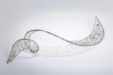 I shaped an armature, and designed bobbin lace patterns to fit its curves. Using 16th century Torchon Ground stitches with 40 strands of twisted stainless steel wire, 21” to 90” long, I made 2 lace crescents by hand. I sewed both to the armature with wire, then wove the ends of the wires into the lace, ornamenting the surface with filigreed spiral motifs.